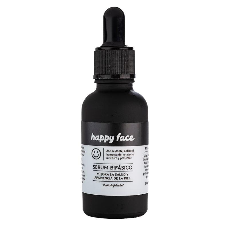 HAPPY FACE. Serum bifásico, mejora la salud y apariencia de la piel. Antioxidante, humectante, anti acné. Relajante, nutritivo y protector. pH 5.5 (ideal para el manto ácido natural de la piel). Estimula la producción natural de colágeno y reduce el tamaño de los poros.